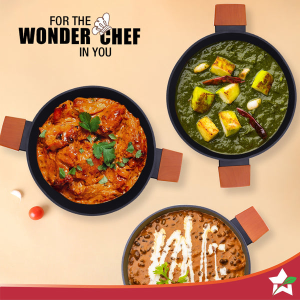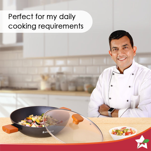 Caesar Forged Kadhai with Glass Lid, 24cm, Black, Greblon C3 Non-stick Coating, Virgin Aluminium, PFOA Free, German Beechwood Handles, Use for Frying, Cooking Rice/ Biryani, Gravies, Dals