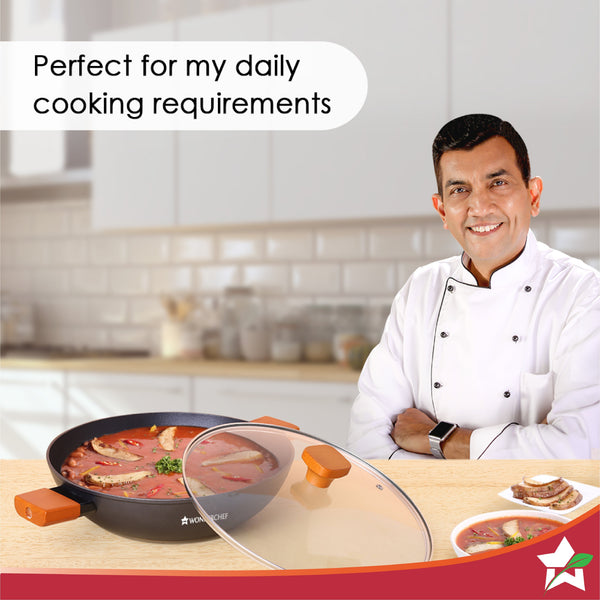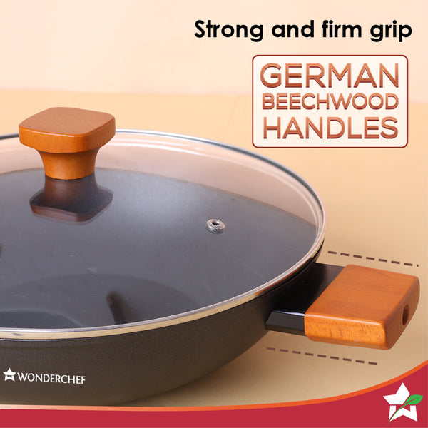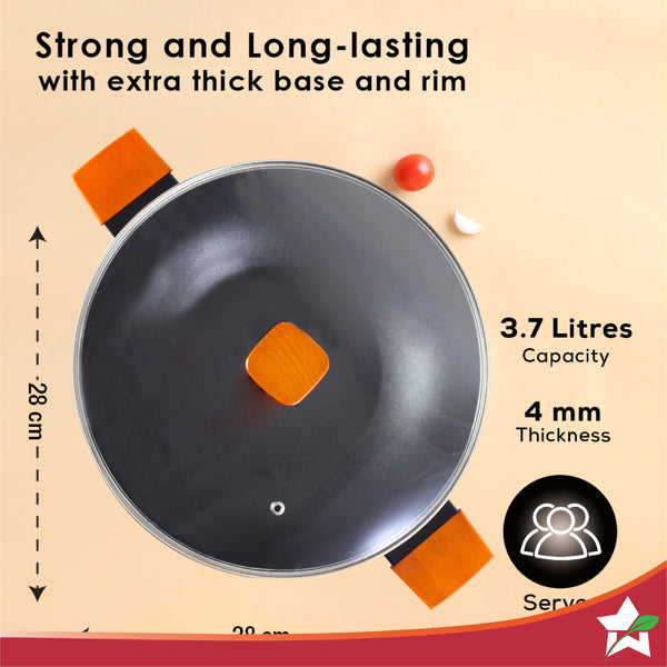 Caesar Forged Kadhai with Glass Lid, 28cm, Black, Greblon C3 Non-stick Coating, Virgin Aluminium, PFOA Free, German Beechwood Handles, Use for Frying, Cooking Rice/ Biryani, Gravies, Dals