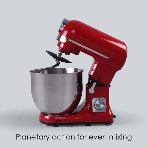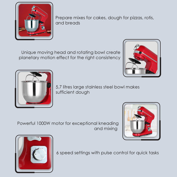 Crimson Edge Die-Cast Metal Stand Kitchen Mixer & Beater with free attachments | 5.7L SS Bowl | 1000W motor | 6 Speed Setting | Whisking Cone, Mixing Beater & Dough Hook attachments | 3 Yrs warranty | Red