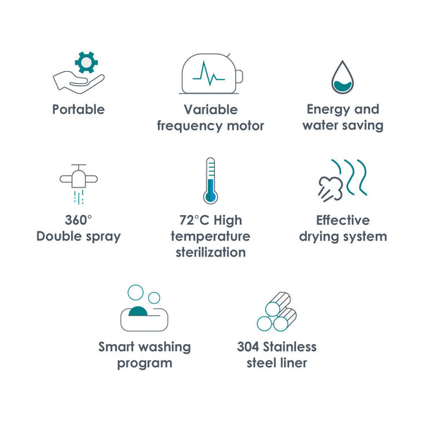 CounterTop Dishwasher, 1250W, 72°C High Temperature Sterilization, 360°Double Spray, Effective Drying System, Portable, 9L