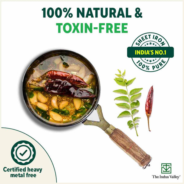 100% Pure Sheet Iron Tadka Pan with Wooden/Silicone Handle, Seasoned, Toxin-free, 0.8/0.43ml