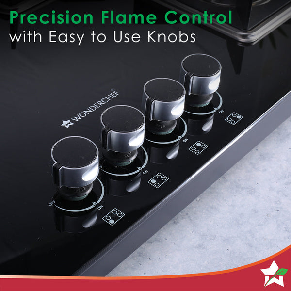 Octavia 4 Burner Glass Hob Top Auto Cooktop | 8mm Toughened Glass | Auto Ignition | Forged Brass Burners | Stainless Steel Drip Tray | Anti-Skid Legs | Large & Heavy Pan support | LPG compatible | Black steel frame | 2 Year Warranty | Black