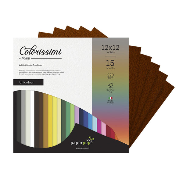 Paper Pep Colorissimi is a high quality coloured in the pulp, 220gsm paper. It is acid free and therefore very long lasting. There's a marked difference in the surface finish between the two sides. One side is a delicate felt-marked surface, which provides excellent grip for pastels, charcoal etc, the other side is smooth. Produced with FSC® certified pulps from responsibly managed forests that are respectful of environmental, social and economic standards. The broad range of 27 colours, from delicate pastel shades to strong, bright colours makes Paper Pep Colorissimi ideal for various applications such as display and presentation, paper construction, collage, pastel and charcoal paintings, coloured pencils, pen and ink, origami, report covers etc. Ideal for different techniques, from scrapbooking, cardmaking, or running through your die cutting and embossing machine to create embellishments for scrapbook layouts, tags, gift bags, and a whole lot more, make them the perfect and complete range for both students and artists. Create something amazing, cut out wonderful shapes and just let your imagination go bonkers! Due to its thickness and texture, it should be tested on one sheet before printing, but nevertheless it is suitable for both inkjet and laser printing. Paper Pep Colorissimi is available in four sizes: A5, A4, 305 x 305mm (12" x 12") and 500 x 700mm (approx. 28" x 20"). Made in Italy.
