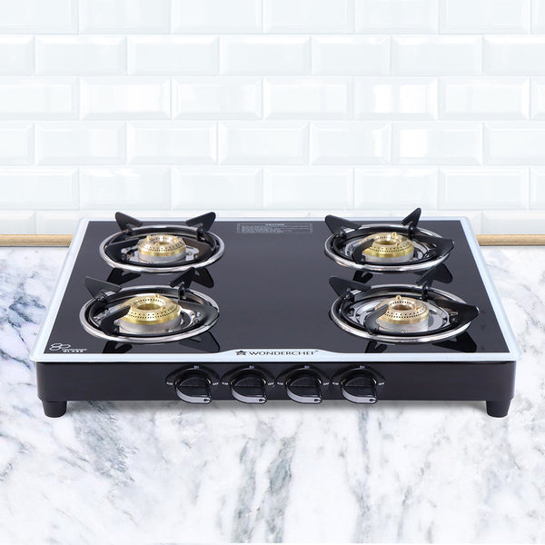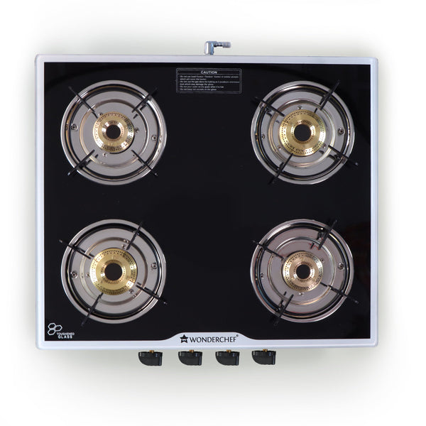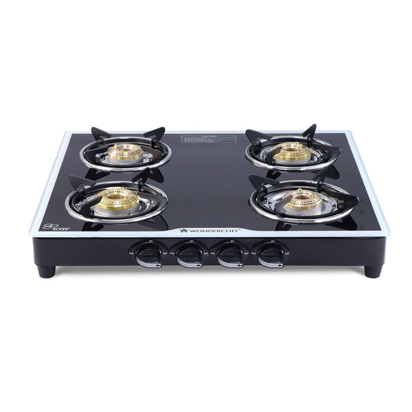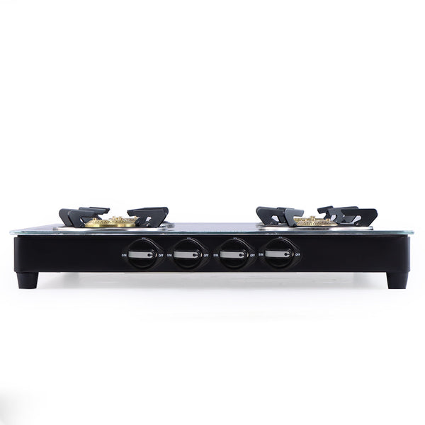 Platinum 4 Burner Manual Glass Cooktop | 6mm Toughened Glass Cooktop | Stainless Steel Drip tray | Anti-Skid Legs | Large Pan support | Manual Ignition | Black steel frame | 2 Year Warranty | Black