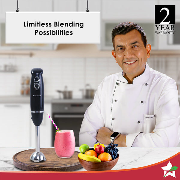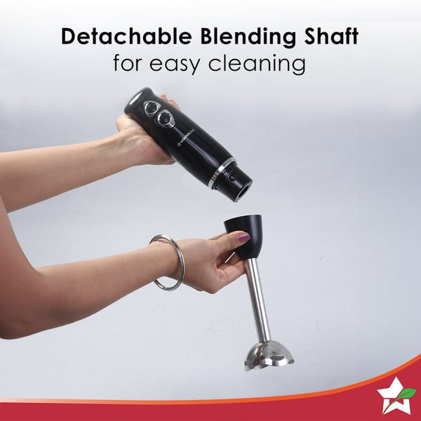 Prima Electric 180 W Hand Blender I Portable | Compact Easy Grip Body I Single Push Button Operation | Sharp Food Grade Anti Rust Stainless Steel Blades | Make Puree, Baby Food, Soup, Smoothie | Detachable Stainless Steel Shaft | 2 Years Warranty | Black