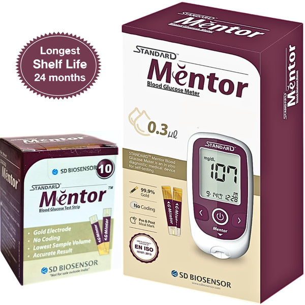 STANDARD Mentor Digital Blood Glucose Meter for self Diabetes testing monitor machine with 10 Strips & complete medical device Kit - Glucometer (Magenta)