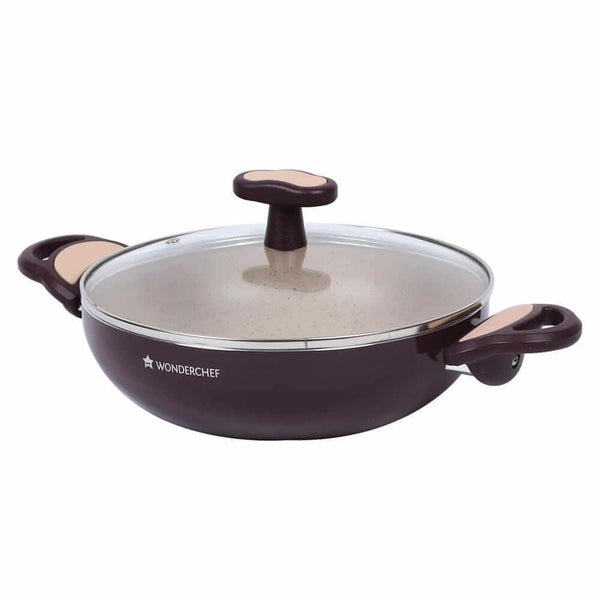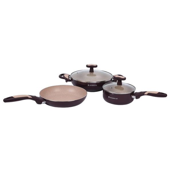 Burlington Nonstick Cookware Set, 5Pc (Wok with Lid, Sauce Pan With Lid, Fry Pan), Induction Bottom, Soft-touch Handles, Virgin Grade Aluminium, PFOA/Heavy Metals Free, 3mm, 2 Years Warranty, Maroon and Beige