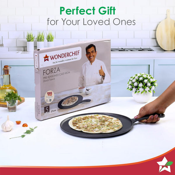 Wonderchef Forza Cast-Iron 27 cm Dosa Tawa Pan | Pre-Seasoned Cookware | Induction Friendly | 4 mm | with Lifetime Exchange Warranty