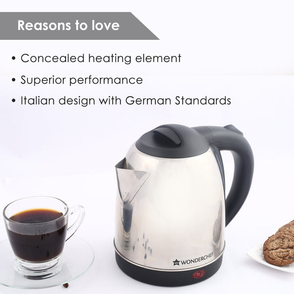 Prato Automatic Stainless Steel Cordless Electric Kettle, 1.5 Litres, Built-in Metal Filter, 304 Stainless Steel Interior, Ergonomic Handle Design, 1000W, 2 Years Warranty