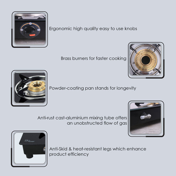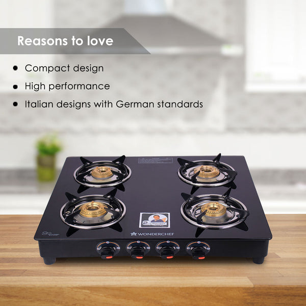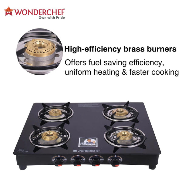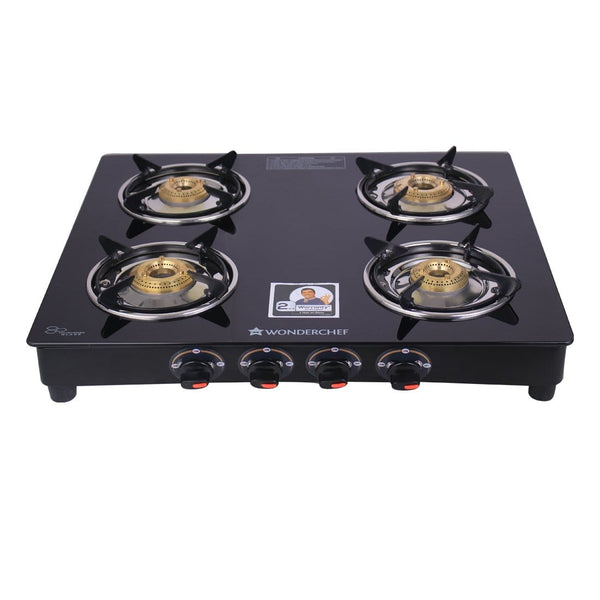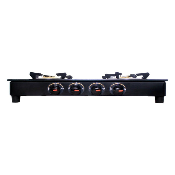 Ruby 4 Burner Glass Cooktop, Black Toughened Glass with 1 Year Warranty, Ergonomic Knobs, Heat-Efficient Brass Burners, Stainless-steel Spill Tray, Manual Ignition