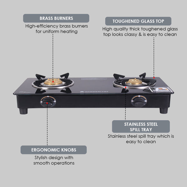 Ultima 2 Burner Manual Glass Cooktop | 6mm Toughened Glass Cooktop | Stainless Steel Drip Tray | Anti-Skid Legs | Large Pan support | Manual Ignition | 360 Degree Revolving Nozzle | Black Steel frame | 2 Year Warranty | Black