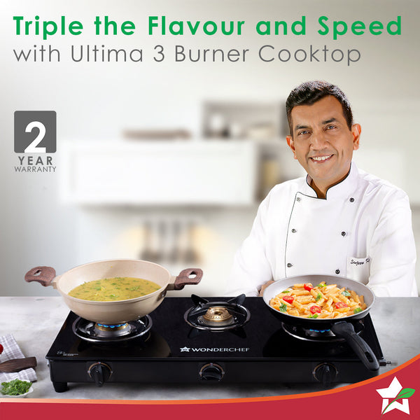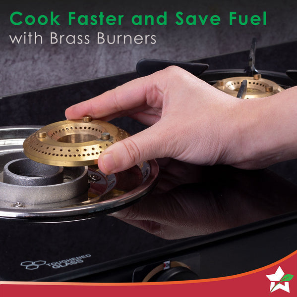 Ultima 3 Burner Manual Glass Cooktop | 6mm Toughened Glass Cooktop | Stainless Steel Drip tray | Anti-Skid Legs | Large Pan support | Manual Ignition | 360 degree Revolving Nozzle | Black steel frame | 2 Year Warranty | Black
