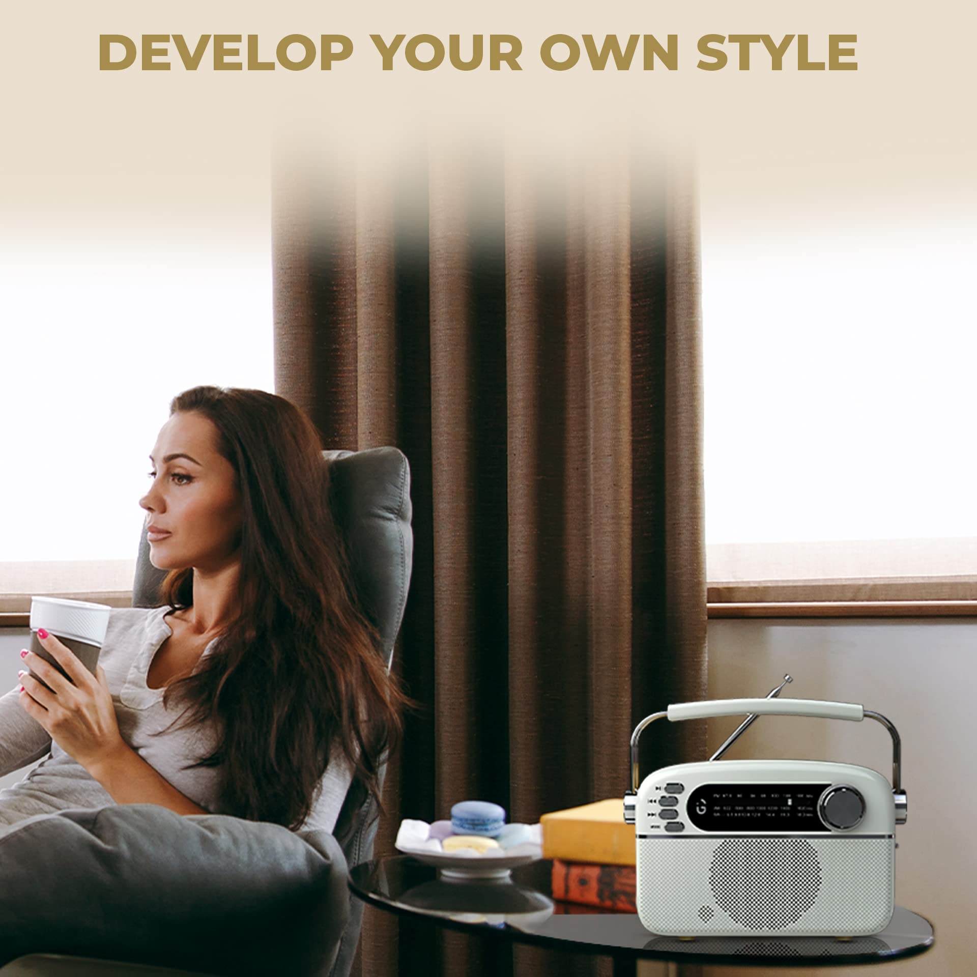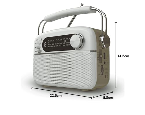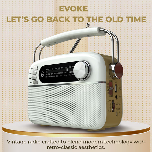 iGear Evoke Retro Modern style Radio and MP3 player with FM/AM/SW, 3 bands, Bluetooth speaker, USB, TF/SD Card, 1200mAh rechargeable battery, Solar charger, Material ABS and Metal, Colour Pearl White and Champagne Gold, 1 Year Free replacement warranty.