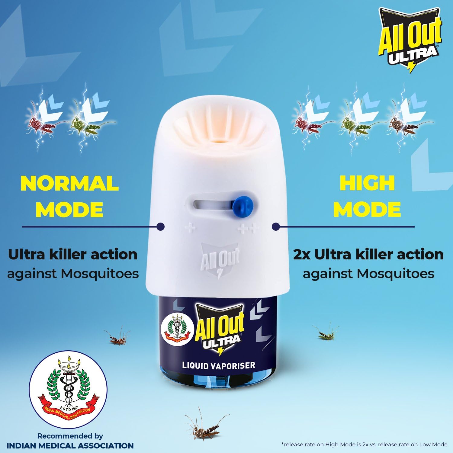 All Out Ultra Liquid Vaporizer, Machine + 3 Refills (45ml each) | Kills Dengue, Malaria & Chikungunya Spreading Mosquitoes| India's Only Mosquito Killer Brand Recommended by Indian Medical Association