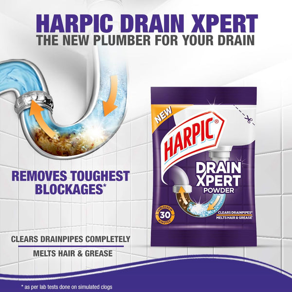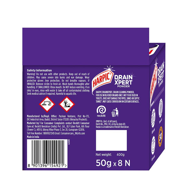 Harpic DrainXpert Drain Cleaning Powder (50g x 8) | Removes Blockages in Pipes, Sinks & Septic Tanks| Works within 30 minutes | Melts Grease & Dissolves Hair (Pack of 2)