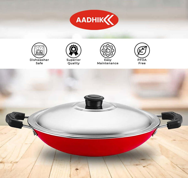 AADHIK Non-Stick Appa Chetty, Aluminium Appachatty, 23cm Diameter, 2.6mm Appachatti, Gas Compatible, Red
