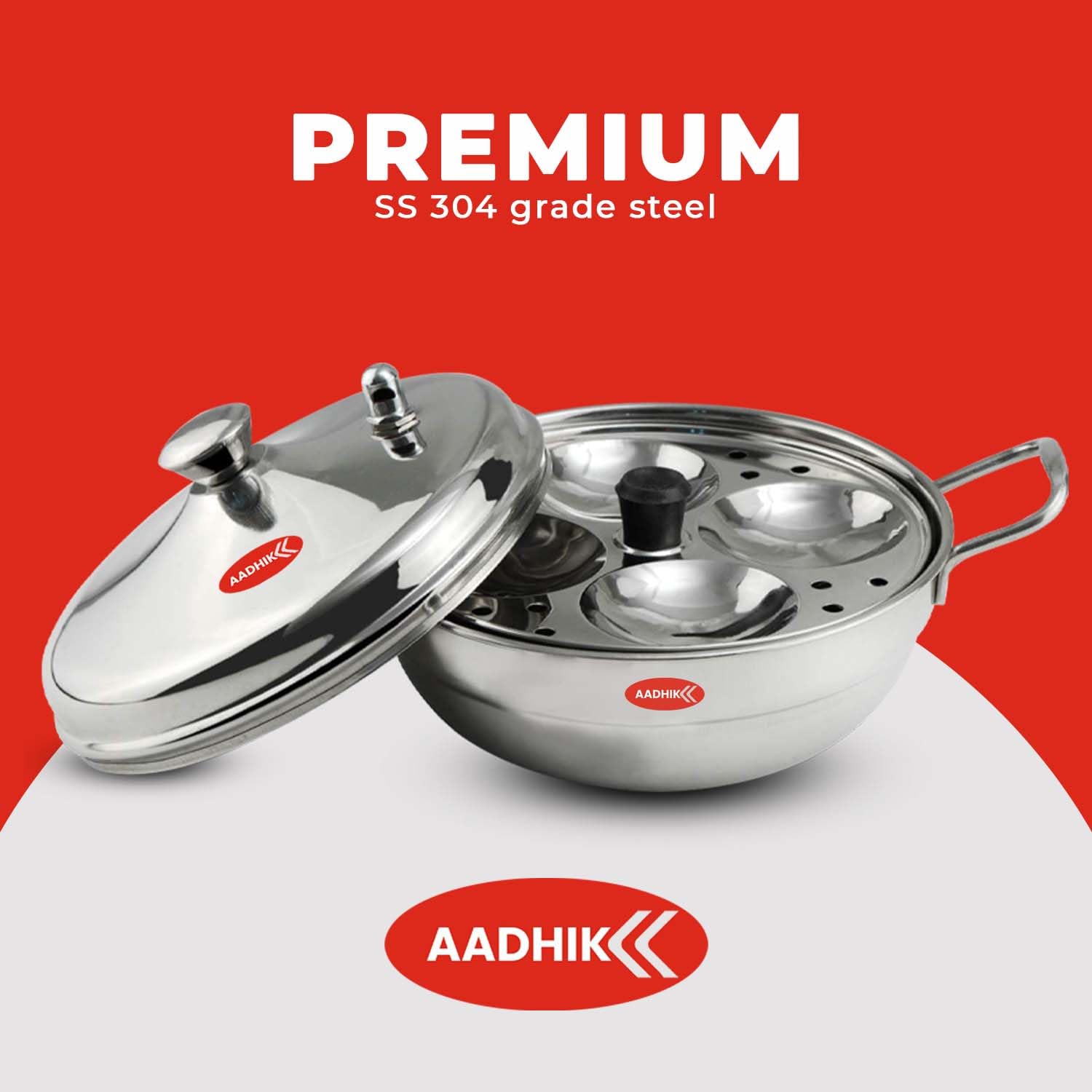 Aadhik Stainless Steel Multi Purpose Kadai with Steel Lid, Idli Maker 2 Idli Plate 8 Cavity Idli Cooker Stainless Steel Idly Pot with Steamer, Silver