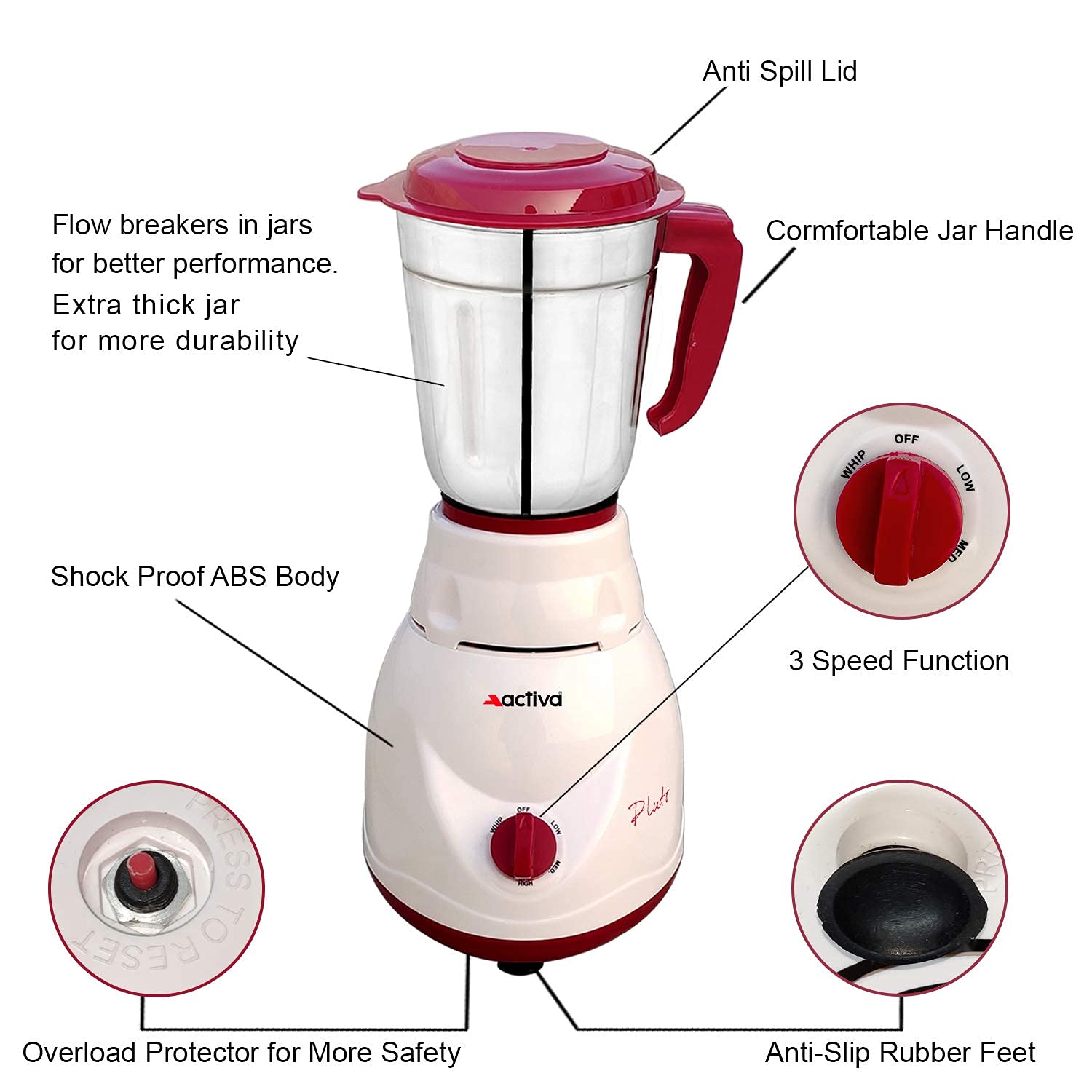 ACTIVA Plastic Pluto Pro Mixer Grinder, 500W, 3 Jars (White) 2 Year Warranty (Ivory Maroon), 500 Watts