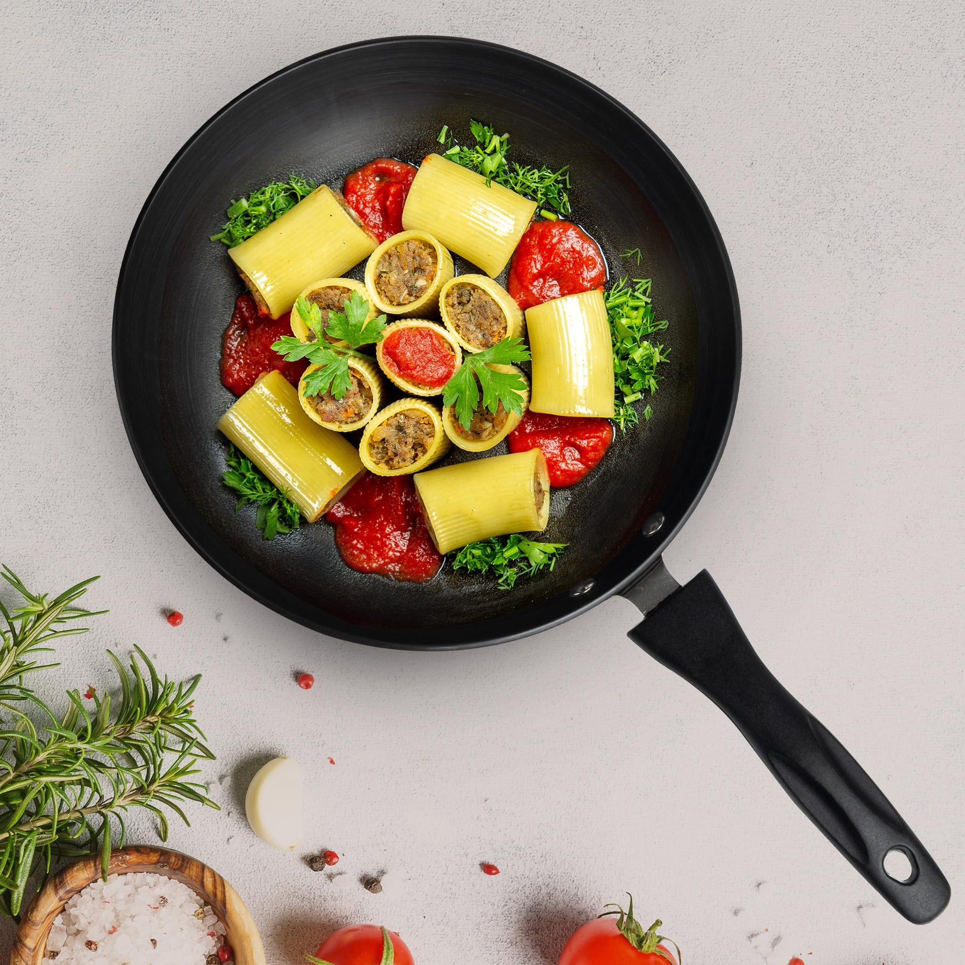 AGARO Elite Hard Anodised Tapper Frying Pan, 1.5L Capacity, 24 cm Diameter, Gas Oven Compatible, 3 mm Thick Plate, Riveted Handle, Frying, Cooking, Serving, Black