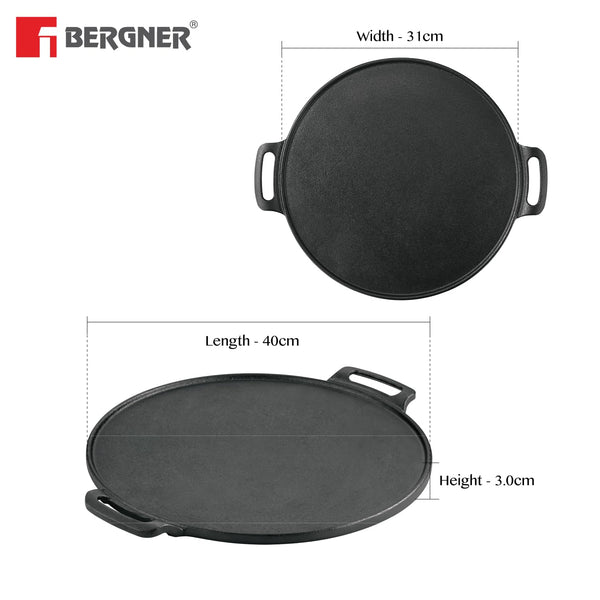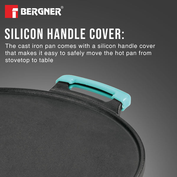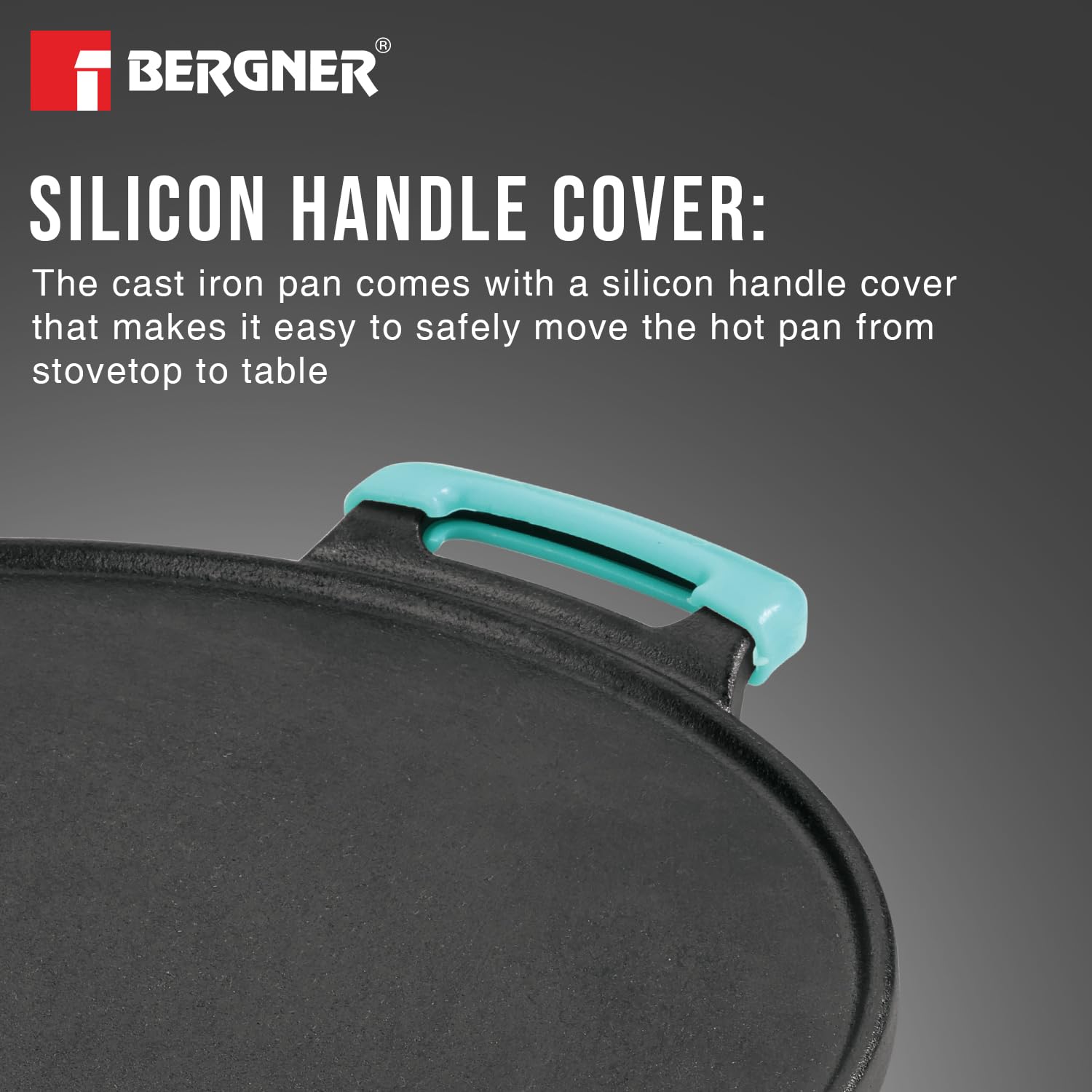 Bergner Eco Cast Iron 30cm Dosa Tawa, Pre-Seasoned, Large Loha Tawa for Dosa, Even Heat Distributor, Retains Heat to Enhance Flavor, Comes with Silicone Sleeve - Induction Base and Gas Stove Ready