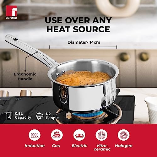 BERGNER Tripro Triply Stainless Steel Saucepan/Tea Pan/Milk Pan, 14 Cm, 1.2 LTR, Chai Pan Without Lid, Induction and Gas Ready, Heavy Bottom, Long Stay Cool Handle, Silver,Polished, 1.2 Liter