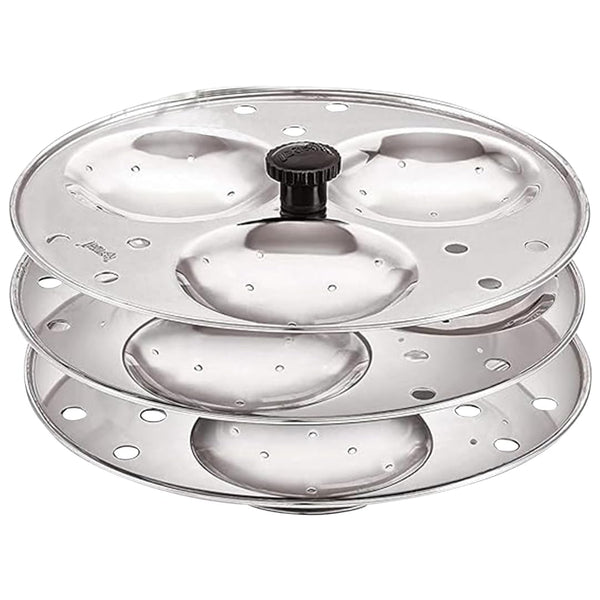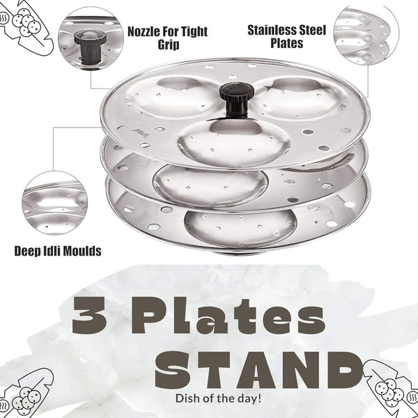 Blluex Stainless Steel Heavy Quality Idli Stand For 5 Liter above Cooker Idli Maker Makes 9 Medium Size Idlis At Once With Stand Kitchen Tool 3 Plates - Silver