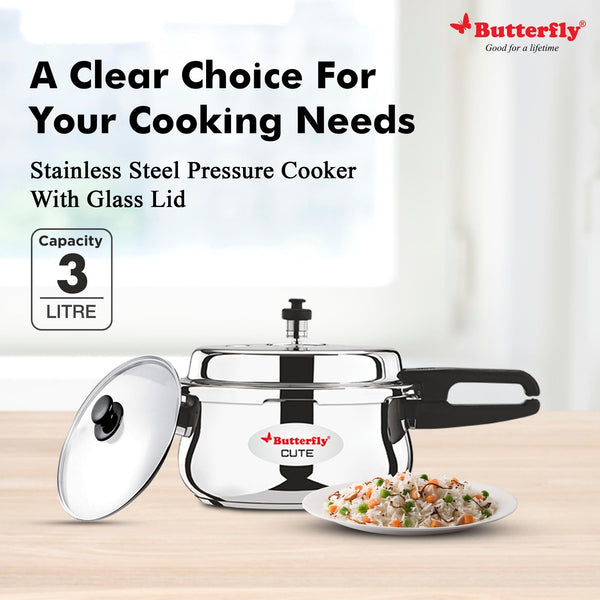 Butterfly Cute Ss Induction Compatible Outer Lid Stainless Steel Pressure Cooker With Glass Lid 3 liter, Silver