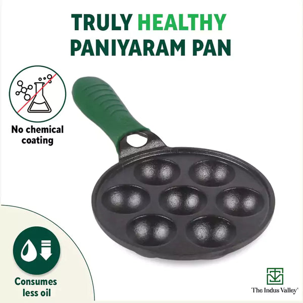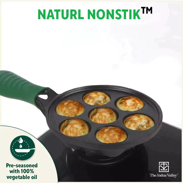 7 Pit/Cup CASTrong Cast Iron Paniyaram/Appe Pan+ Cool Silicone grip, Pre-seasoned, Nonstick, 100% Pure, Toxin-free, 21.5 cm, 1.7 kg