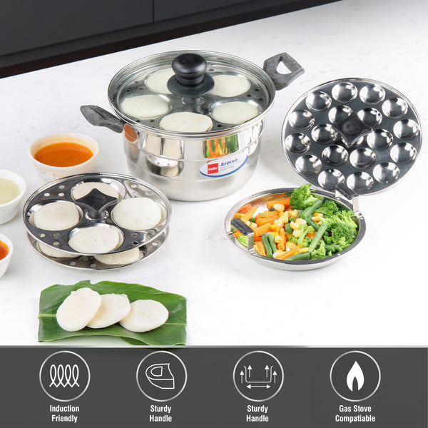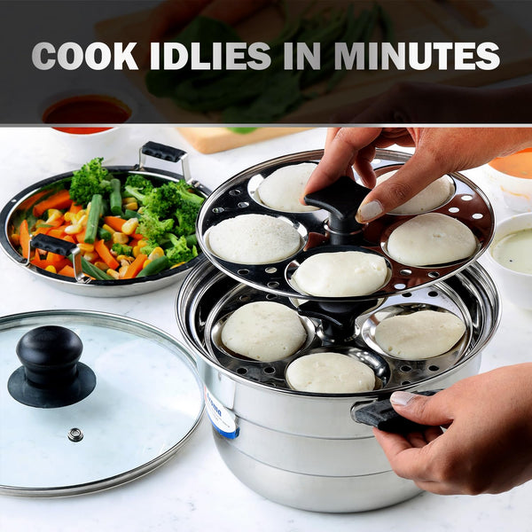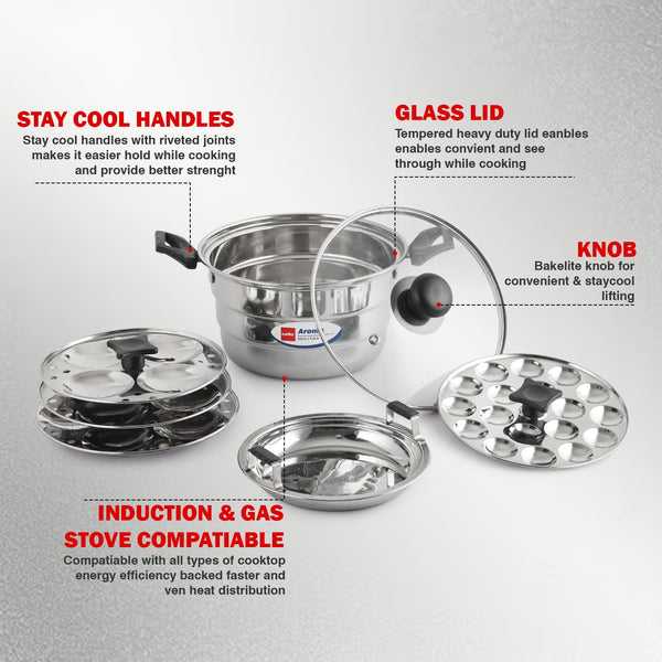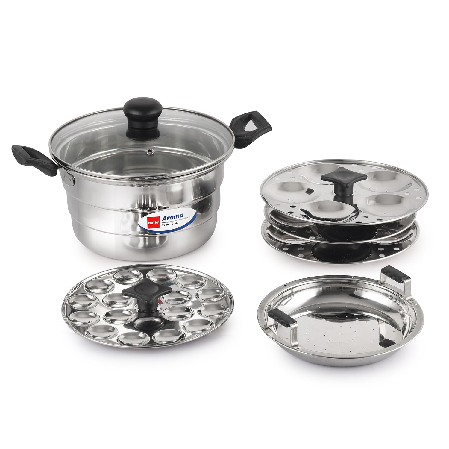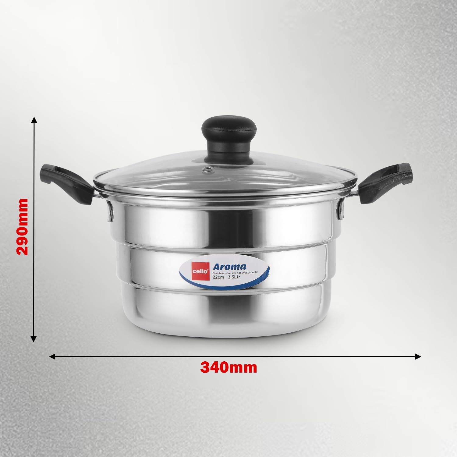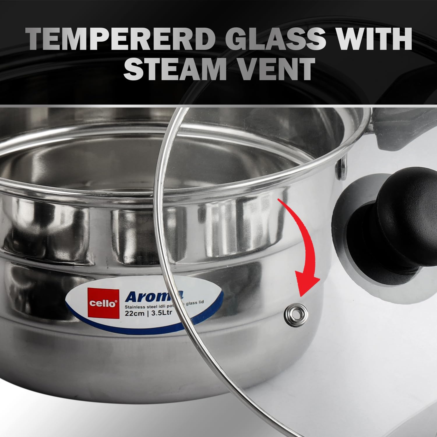 Cello Aroma Stainless Steel Idli Pot with Glass Lid with Multiple Plates 22cm, Silver, 3.5 liter | Compatible With Gas Stove & Induction | Ideal For Dhokla, Patra, Idli, and Momos