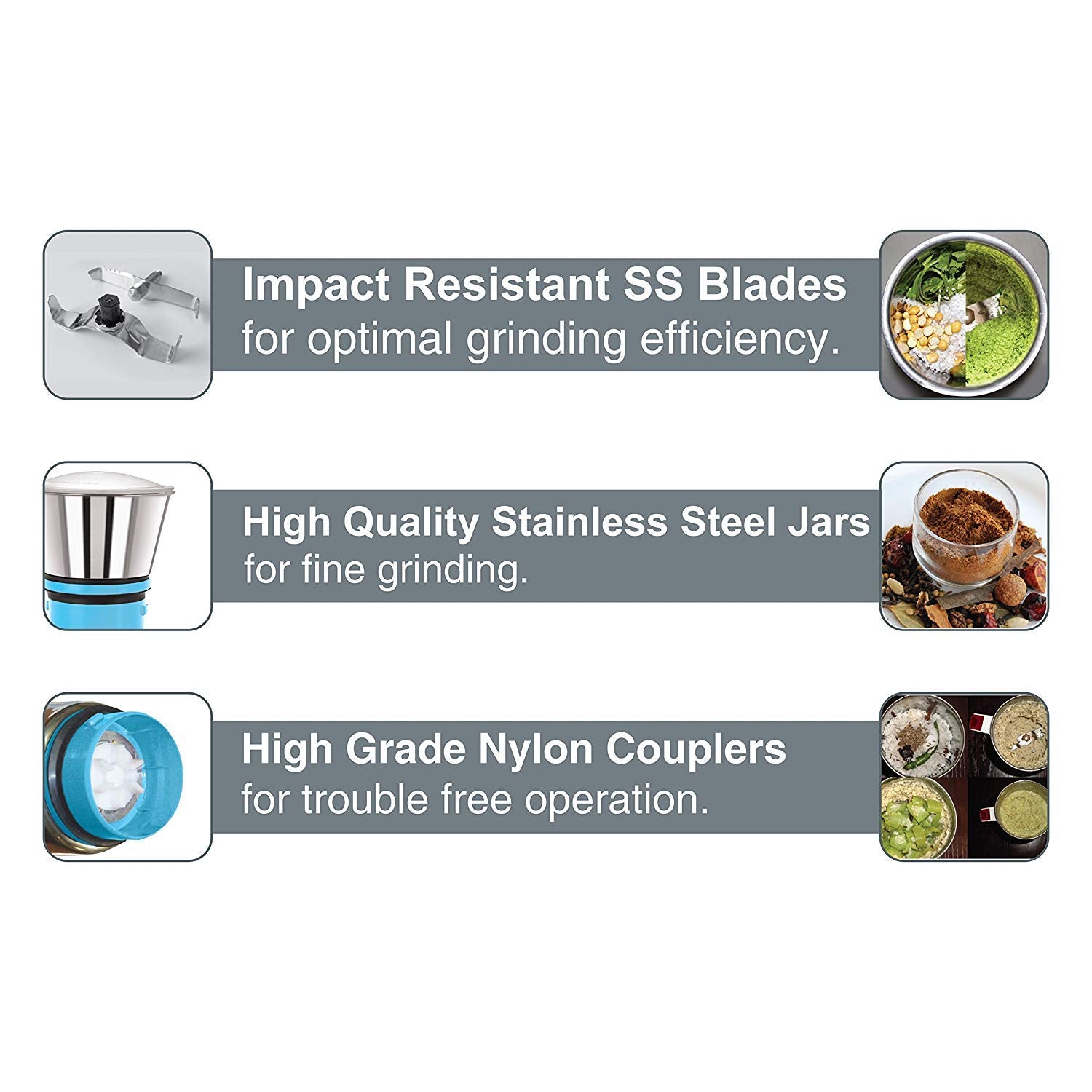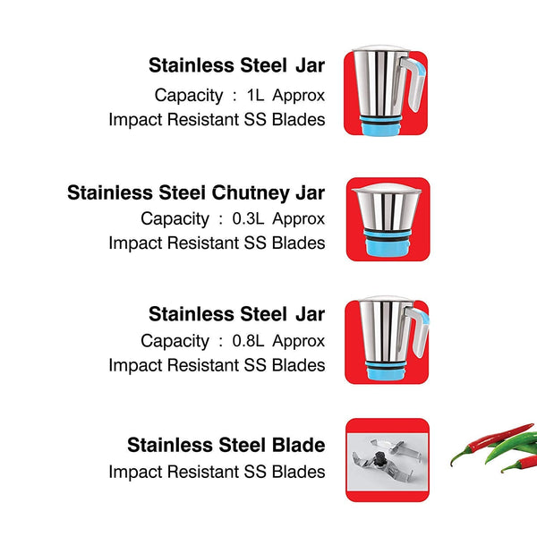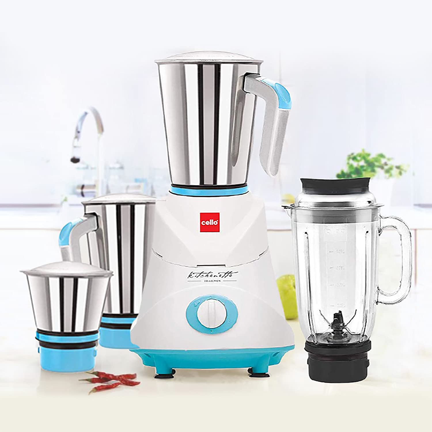 Cello Grind-N-Mix Elite Mixer Grinder, 500 Watts, 3 Stainless Steel Jar and 1 Juicer Jar, Blue and White