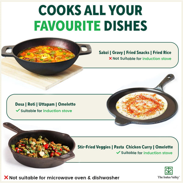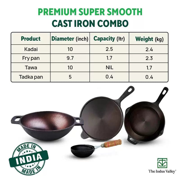 Super Smooth Cast Iron Set: Kadai+ Tawa+ Frypan, Kitchen set for Home, Nonstick, 100% Pure, Toxin-free, Free ₹400 Tadka Pan