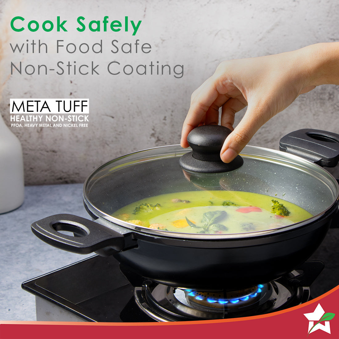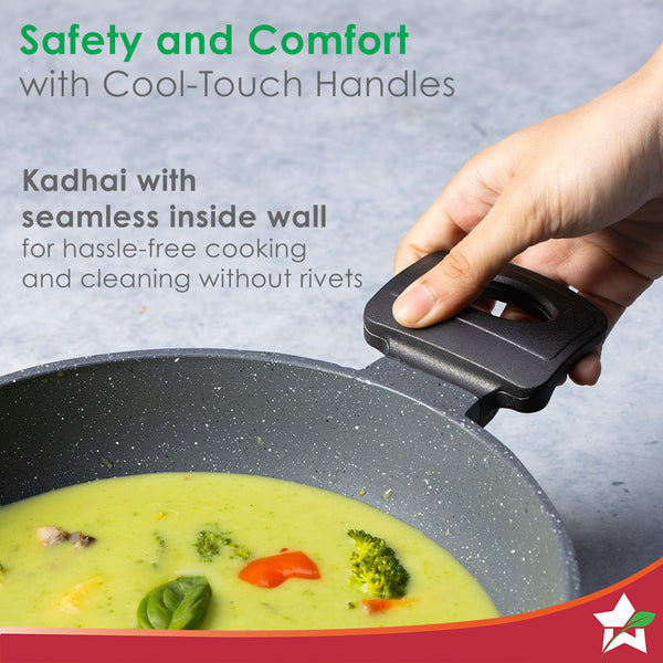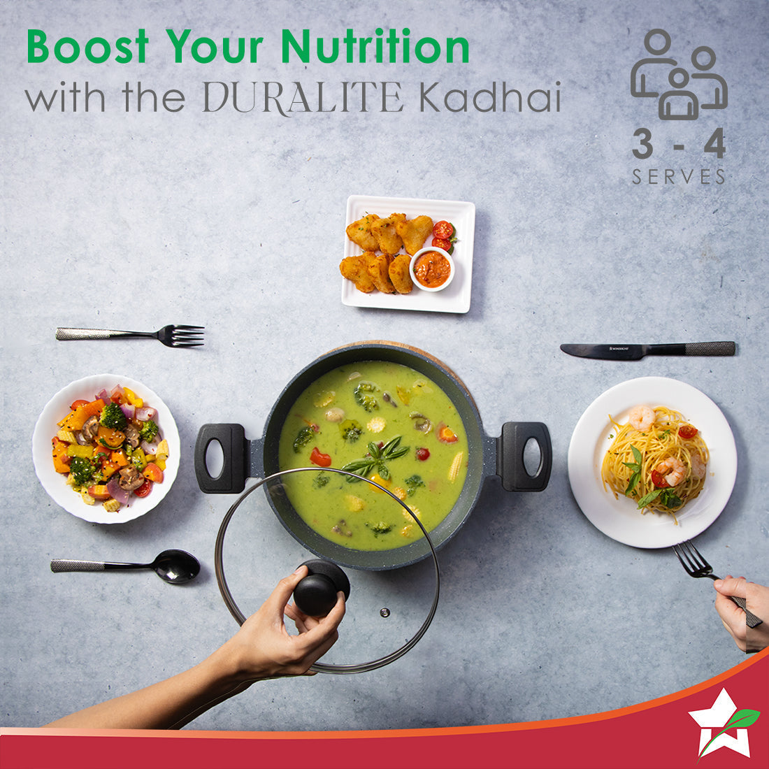 Duralite Die-Cast Kadhai with Lid | 24 cm | 2.4 L | 5 Layer Meta-Tuff Non-Stick Coating | Never Loses Shape | Non-Toxic | Cool Touch Handles and Knob | PFOA Free | Pure Grade Aluminium | Easy to Clean | Grey | 2 Years Warranty