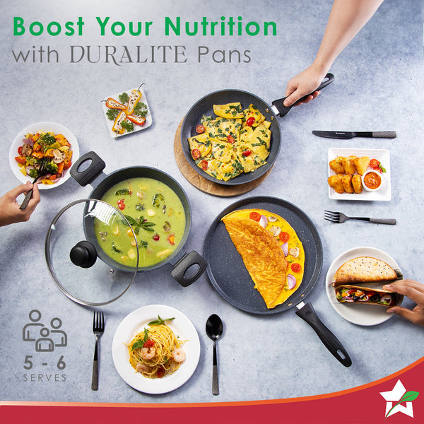 Duralite Die-Cast Non-Stick Pans 4 pcs Set | 24 cm Kadhai with Lid, 24 Cm Fry Pan, 28 cm Dosa Tawa | 1.2 L | Grey | 2 Years Warranty