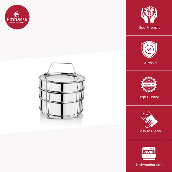Embassy Stainless Steel Cooker Separator | Suitable for 5 Litres Prestige Popular and Popular Plus Outer Lid Pressure Cookers | 3 Containers With Lifter | Dimension 17x17x15 cm
