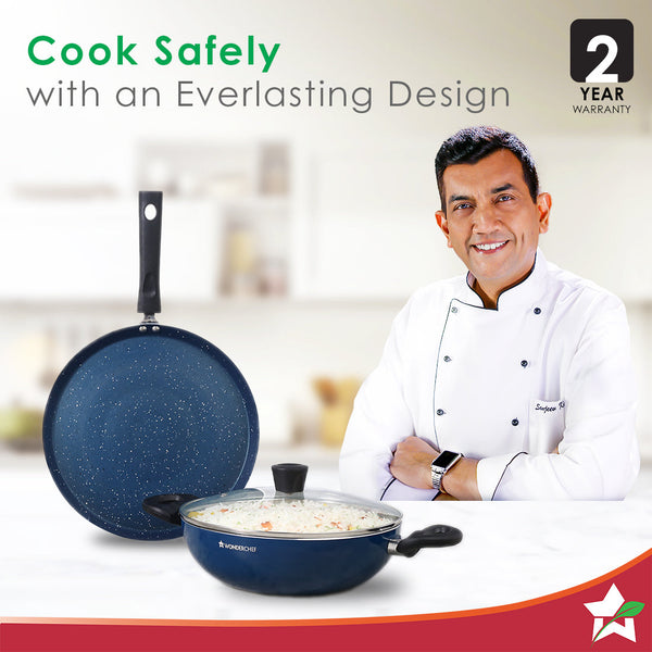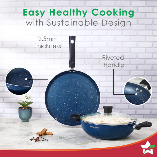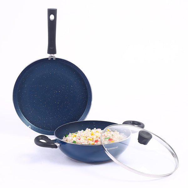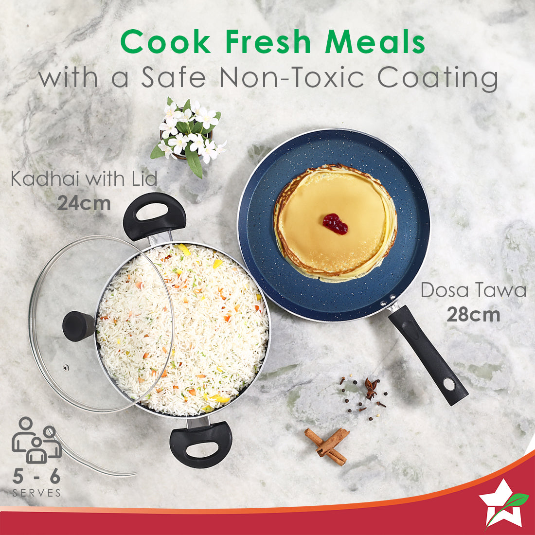 Galaxy 3pcs Cookware Set | Kadhai with Lid and Dosa Tawa | Induction Friendly | Cool Touch Bakelite Handles | Pure Grade Aluminium| PFOA Free| 2 Years Warranty | Midnight Blue