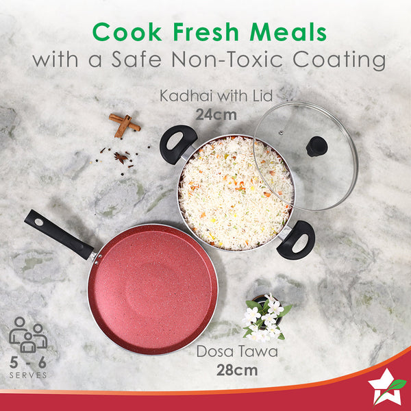 Galaxy 3pcs Cookware Set | Kadhai with Lid and Dosa Tawa | Induction Friendly | Cool Touch Bakelite Handles | Pure Grade Aluminium| PFOA Free| 2 Years Warranty | Red & Black