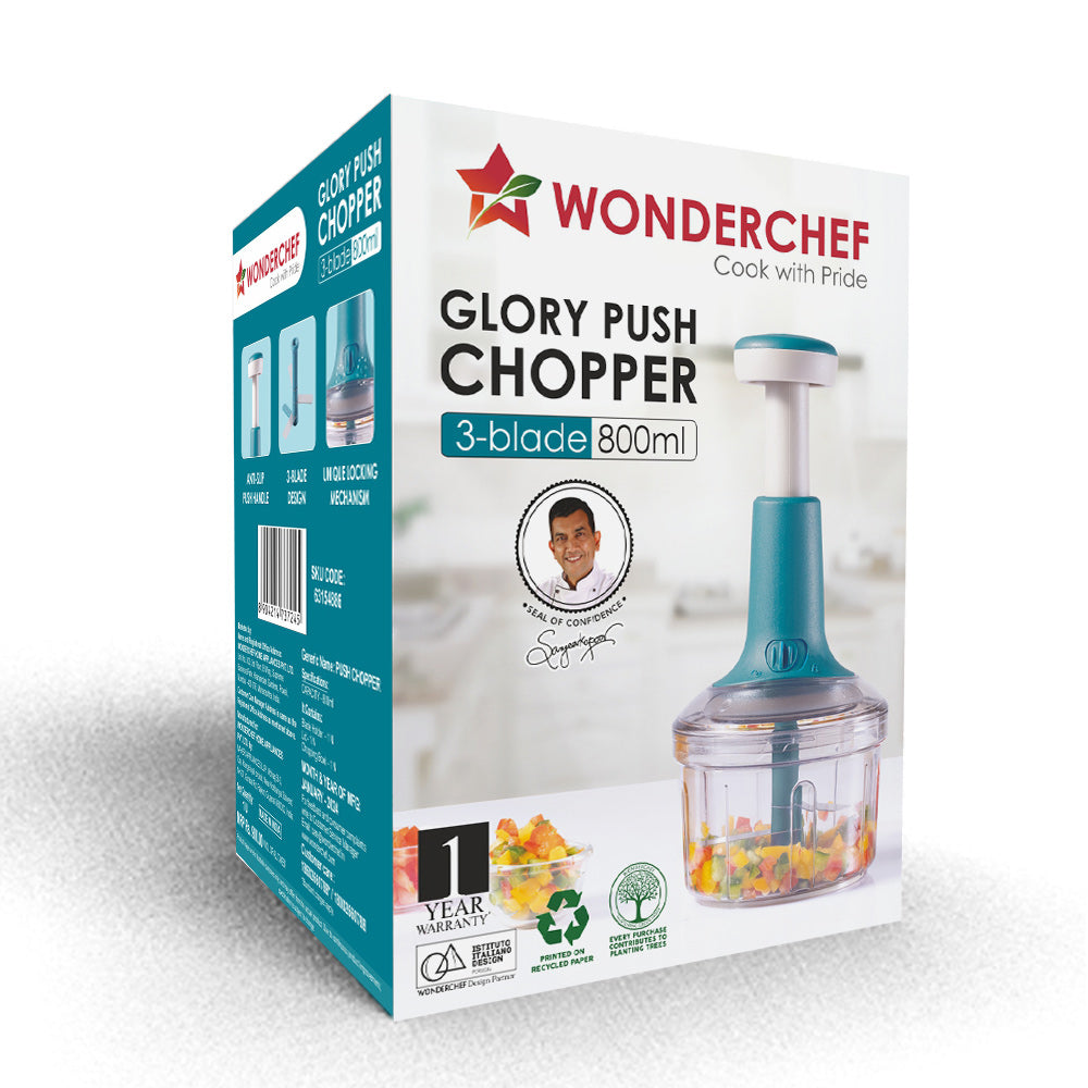 Glory Push Chopper | 800 ml | 3 Stainless Steel Blades | Anti-Slip Silicone | Air Tight Lid | Silicone Supported Base | Efficient String Mechanism | Transparent Jar | Safety Locking Mechanism | Easy to Clean | 1 Year Warranty