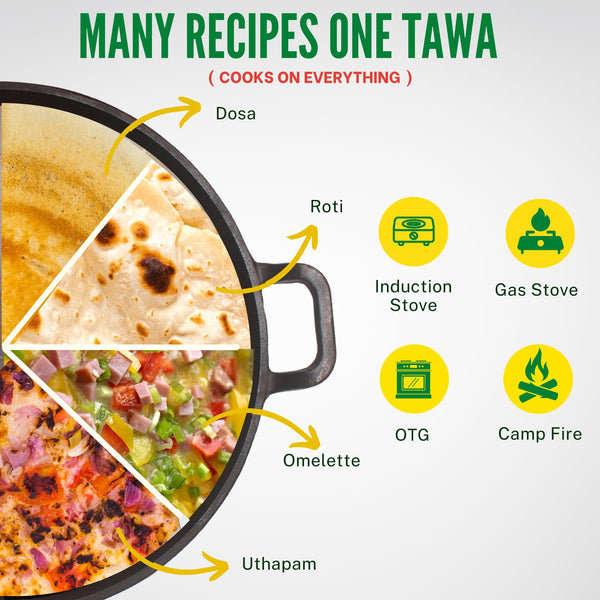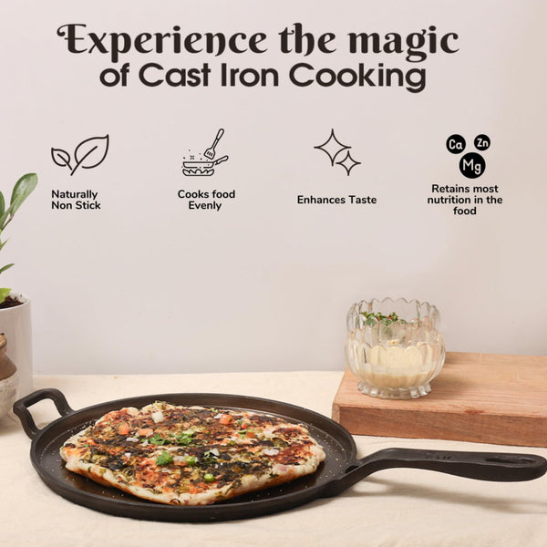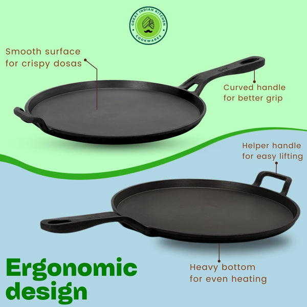 GREAT INDIAN KITCHEN Pre-Seasoned Cast Iron Tawa for Dosa/Roti | 29 Cm | Smooth Finish Dosa Tawa Cast Iron | Induction Compatible | No Chemical Coating | Cast Iron Tawa for Roti - Black