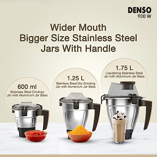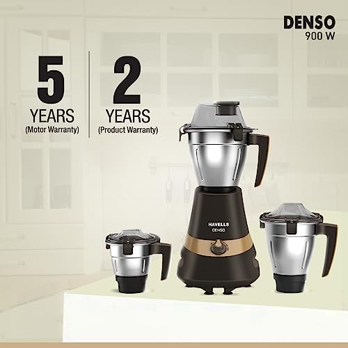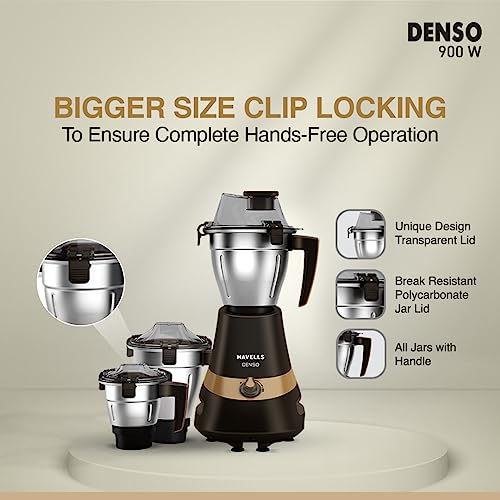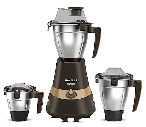 Havells Denso Heavy Duty 900 Watts 3 Jar Mixer Grinder, Ball Bearing Copper Motor, 21000 RPM, Large Size Break Resistant Alluminium Collar Jars with Flow Breaker, 5Years Motor Warranty (Dark Brown)
