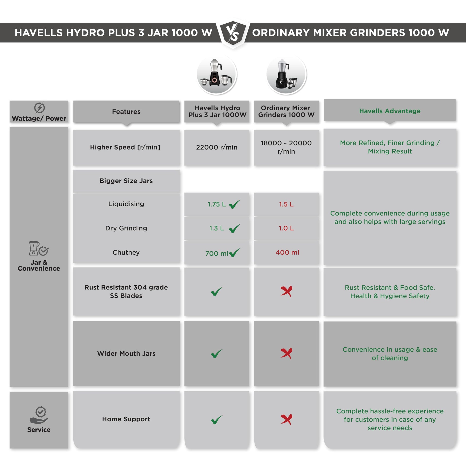 Havells Hydro Plus 1000 watt 3 Jar Mixer Grinder with Ball Bearing Motor, 22000 RPM, Wider mouth Stainless Steel Jar, Hands Free operation, SS-304 Grade Blade & 2 Yr Manufacturer Warranty