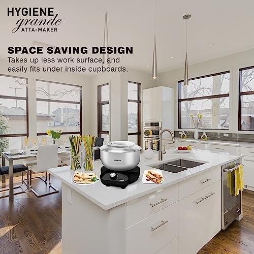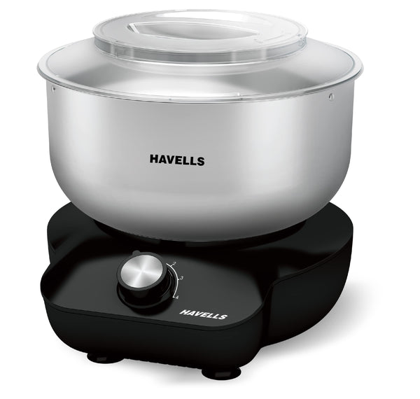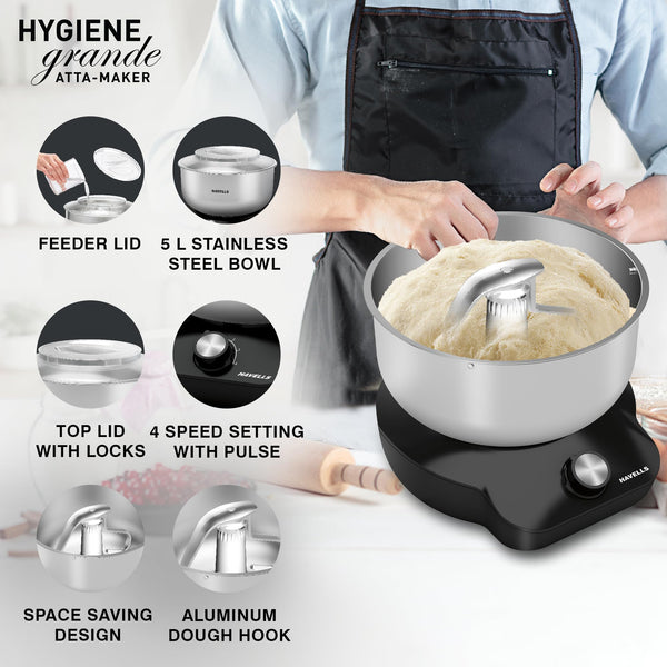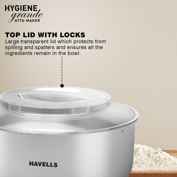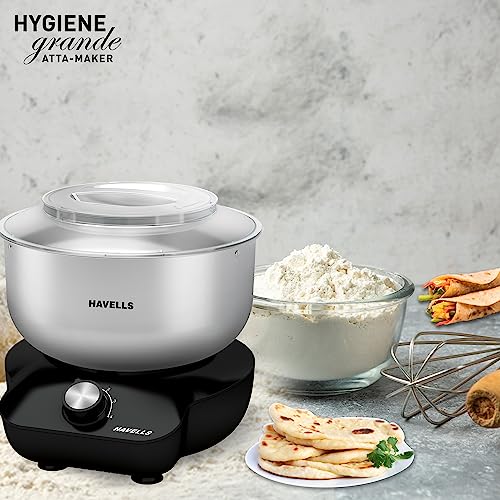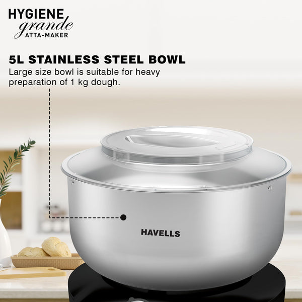 Havells Hygiene Grande Atta Kneader Dough Maker with 5L SS Bowl, Up to 1 KG Dough Maker, 4 Speed, Aluminium Dough Hook, Transparent Anti Splatter Lid with Lock, Hands Free Operation, 2 Yr Warranty