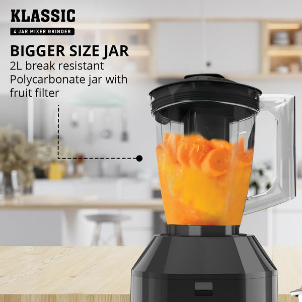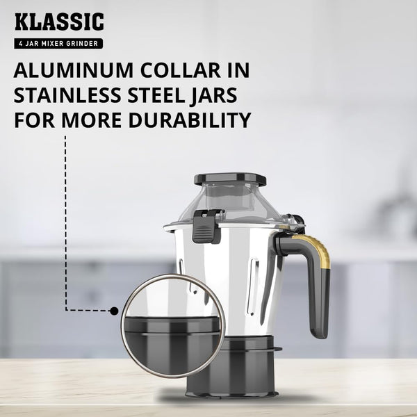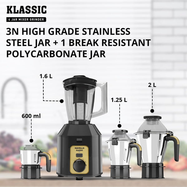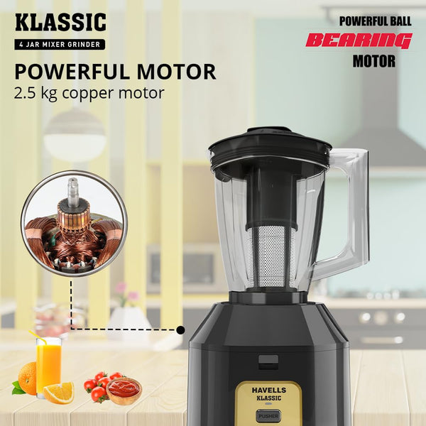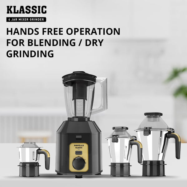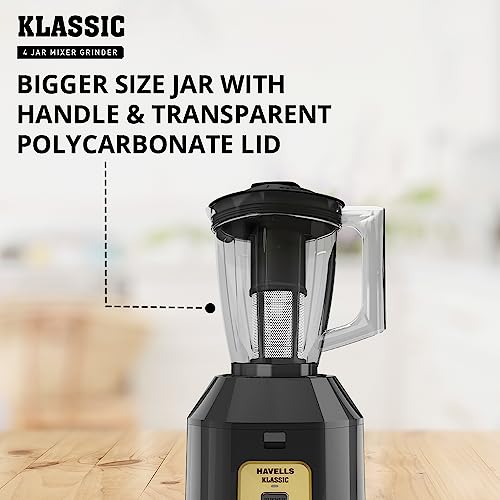 Havells Klassic 1000 watts 4 Jar Mixer Grinder I 2.5 Kg Double Ball Bearing Copper Motor I 22000 RPM I 100 Minutes Run Time I Metal Teeth Coupler & Jar Base I Polycarbonate Jar, Lids with Lock (Grey)