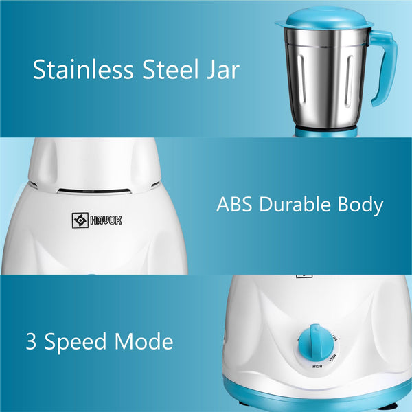 Havok 750 Watt Juicer Mixer Grinder with 2 Jars for Grinding, Mixing, Juicing with Powerful Motor | 2.6 Year Warranty | (White & Blue, 2 Jars)