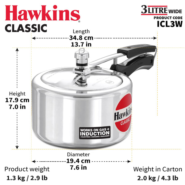 Hawkins Classic 3 Litre Inner Lid Aluminium Pressure Cooker, Induction Cooker, Wide Design Pan Cooker, Best Cooker, Silver (Icl3W), 3 Liter