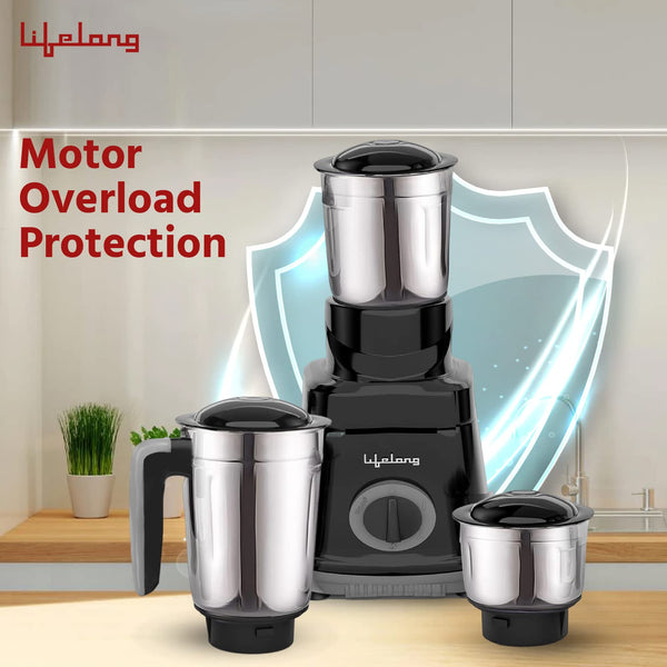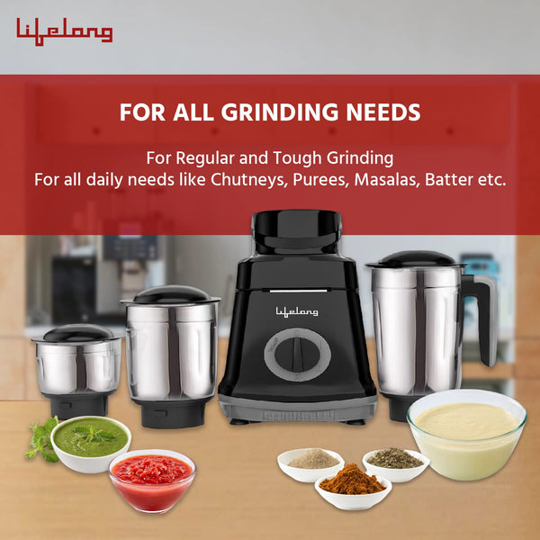 Lifelong LLMG76 750 Watt Mixer Grinder|3 Jars (Liquidizing, Wet Grinding and Chutney Jar)| Stainless Steel blades| 3-Speed & Pulse Function| Anti-Skid Feet| 1 Year Warranty (Black)