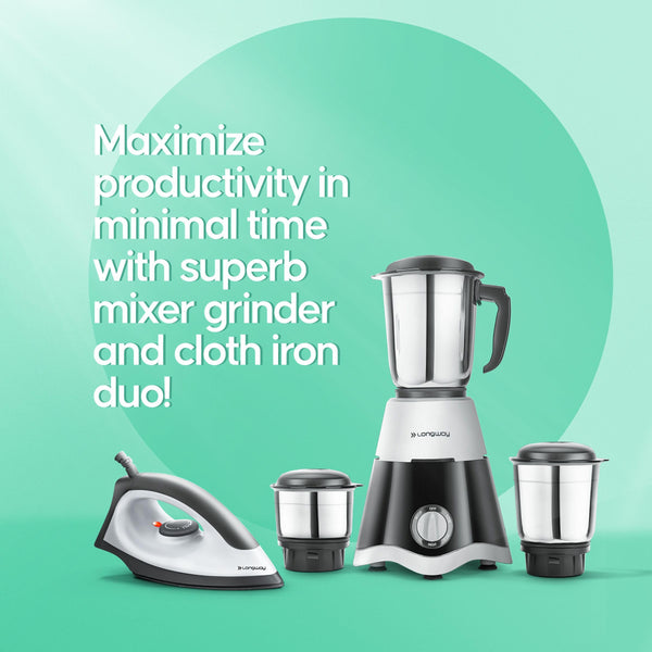 Longway Super Dlx 700 Watt Mixer Grinder with 3 Jars for Grinding, Mixing with Powerful Motor & Kwid 1100 Watt Dry Iron | 1 Year Warranty | (Black & Gray, Combo Offer)