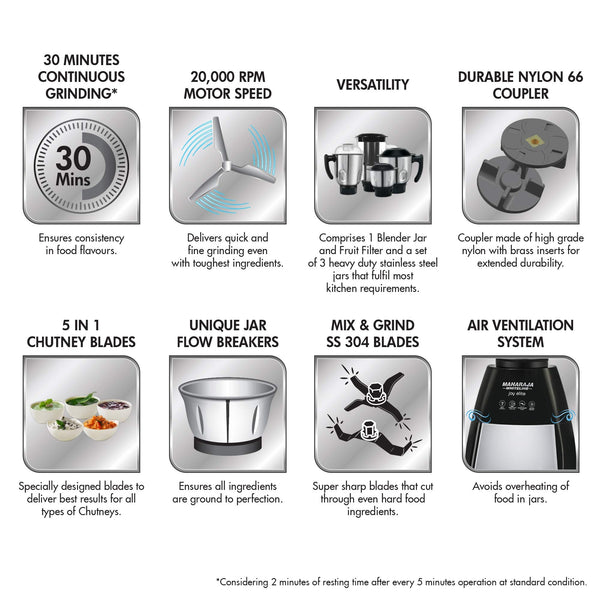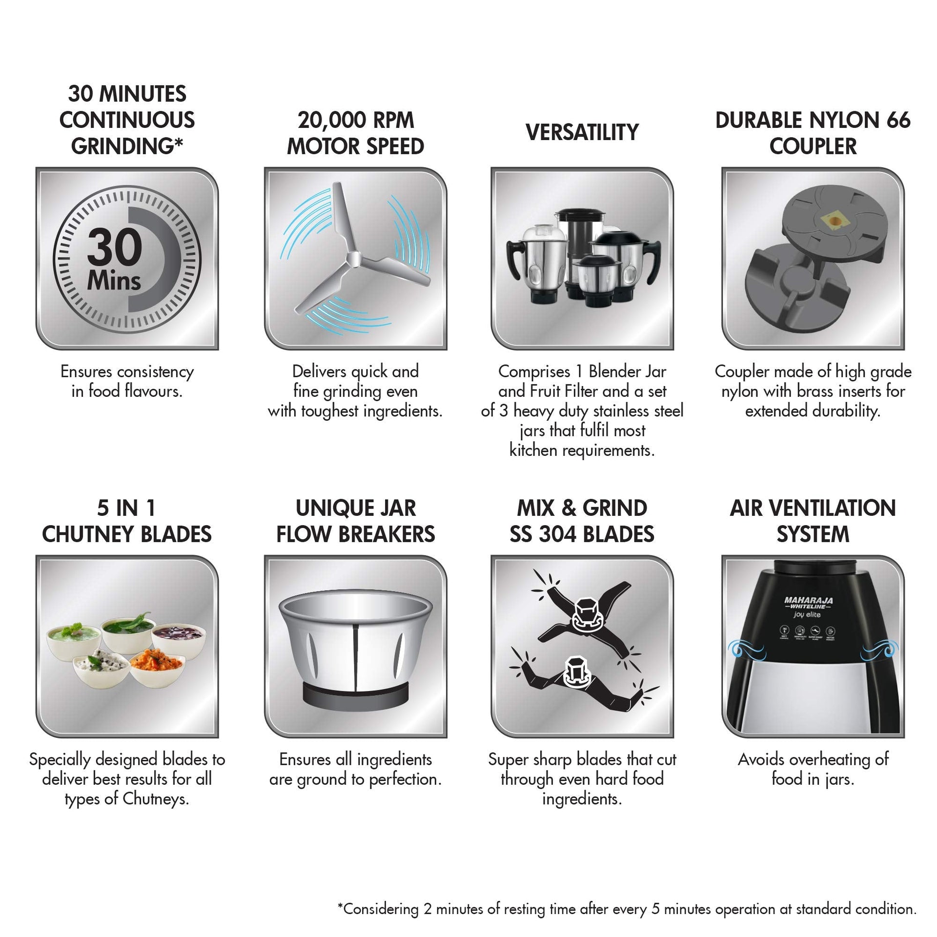 Maharaja Whiteline Joy Elite Mixer Grinder with 4 Jars, Long Lasting Performance with 750 Watt Motor | Jar Flow Breaker | 5 Year Motor Warranty (Black & Grey)