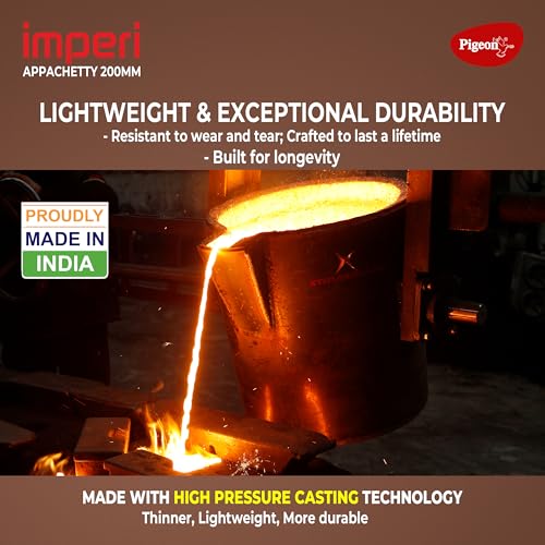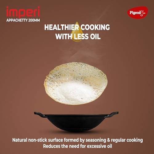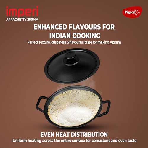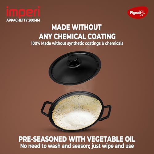 Pigeon by Stovekraft Cast Iron Appachetty with Stainless Steel Lid, 22 cm | Naturally Nonstick | Pre-Seasoned with 100% Vegetable Oil | Toxin-Free | Tasty Appams | Bring Back Nostalgic Taste