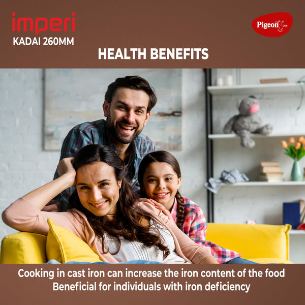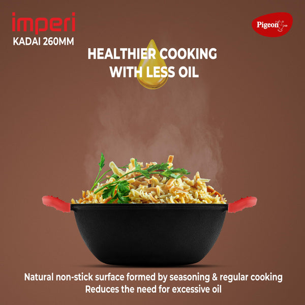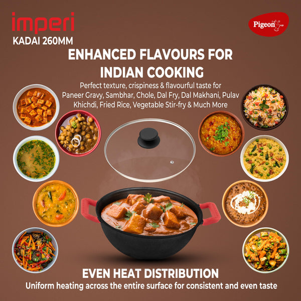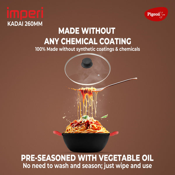 Pigeon by Stovekraft Cast Iron Kadai with Glass Lid | Medium, 26 cm | Naturally Nonstick | Pre-Seasoned Kadhai with 100% vegetable oil | Toxin-Free | High Pressure Casting | Bring Back Nostalgic Taste