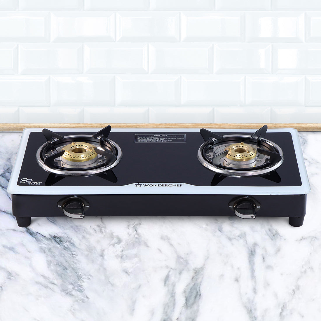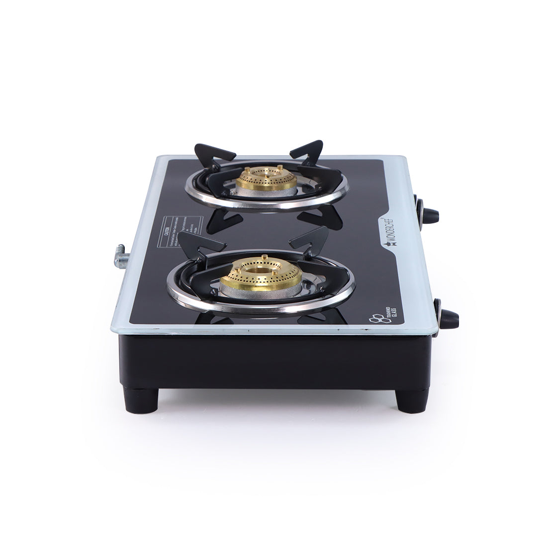 Platinum 2 Burner Glass Cooktop, Black 6mm Toughened Glass with 1 Year Warranty, Ergonomic Knobs, Stainless Steel Drip Tray, Manual Ignition Gas Stove